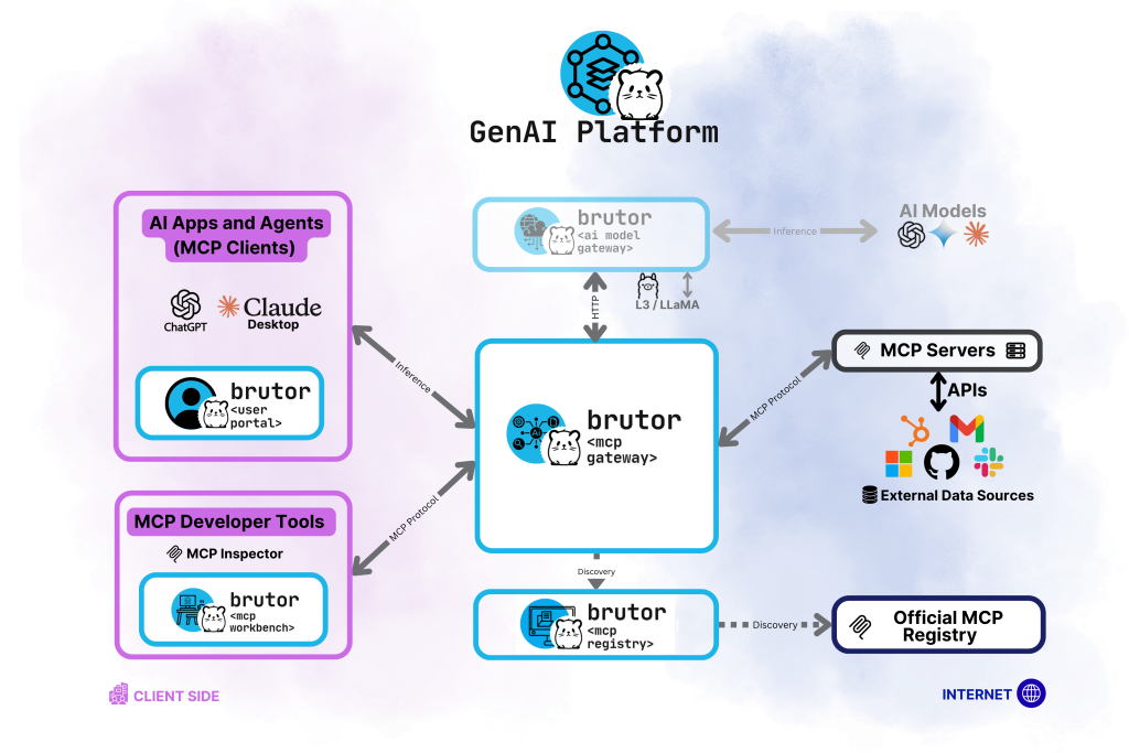 Brutor GenAI Platform is a comprehensive suite of tools designed for both system administrators and MCP developers. These tools integrate seamlessly to simplify the management of your MCP infrastructure.
